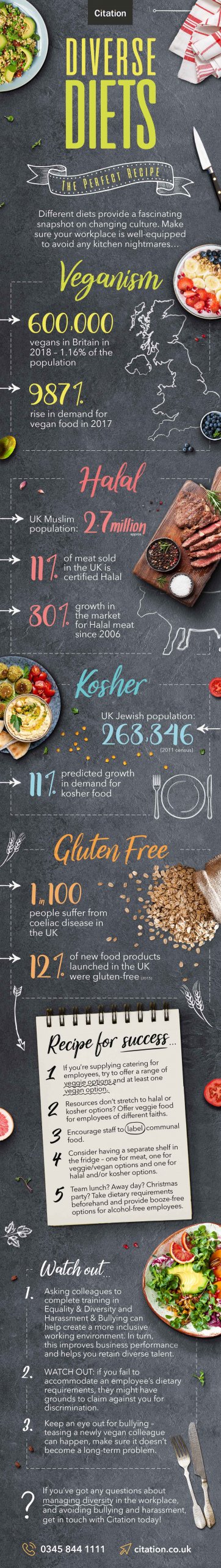 We’ve put together this handy infographic which details some key facts and figures about some of the many different dietary requirements you might come across in the UK and how to make sure that, as an employer, you’re able to make room for everyone’s different beliefs, dietary choices and needs.